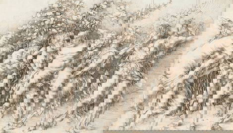 In Italy, Dürer studied the art of the Venetian school and visited other cities in the north, where he was exposed to some of the great work of the Early Renaissance. Dürer’s journal from this period records that he developed a particular admiration for Giovanni Bellini, and his contemporary drawings show the influence of other Italian artists, such as Lorenzo di Credi, Antonio del Pollaiuolo and Andrea Mantegna, making a copy of his Battle of the Sea Gods frieze.