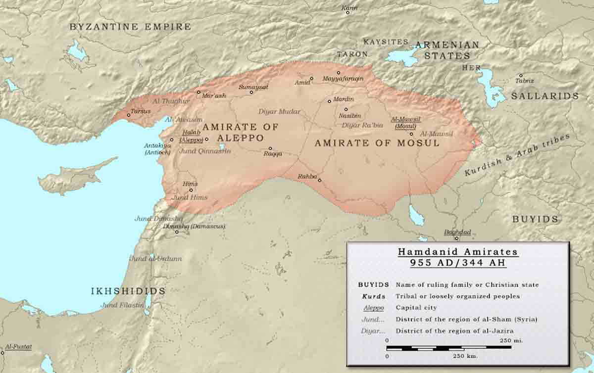 Alī ibn ʾAbū’l-Hayjāʾ ʿAbdallāh ibn Ḥamdān ibn Ḥamdūn ibn al-Ḥārith al-Taghlibī, better known by his honorific title of Sayf al-Dawla or “Sword of the Dynasty” was the most prominent member of the Hamdanid dynasty. His reputation grew due to his successful large-scale raids and by beating Byzantine armies on their home ground. Serious attempts by the Byzantines to put a stop to Sayf’s military actions saw the Domestic of the Schools (commander-in-chief of the Byzantine armies), Bardas Phokas, leading several in-person campaigns against Sayf. Despite having a numerical advantage, the Byzantines were successively defeated in 953, 954, and again in 955. Sayf’s successes were celebrated across the Muslim world who regarded him as the sword of Islam, and the defender of the faith. He attracted many volunteers who joined his cause and under his rule, his capital of Aleppo became the center of a vibrant culture attracting the likes of the famed poet Al-Mutanabbi and the philosopher al-Farabi, which further enhanced Sayf’s reputation and that of his Hamdanid emirate of Aleppo.