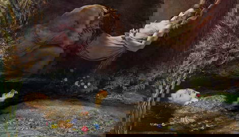 In a typically Romantic enterprise, the divine element is also shown through nature. Although secondary, nature is indeed present in the paintings mentioned earlier and gives them an important spiritual dimension. But none of them feature a prominent spiritual environment more than John Everett Millais’ Ophelia. In this painting, the drowned Shakespearean heroine rests in a peaceful stream, in a tomb of vivid nature. She is surrounded by colorful flowers, each of which holds a very particular meaning. Poppies function as the Christian allegory for Christ’s blood, nettles represent pain, and roses allude to love. There is even a weeping willow tree, a traditional symbol for life after death.