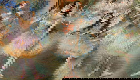 Unlike The Star, Two Dancers by Edgar Degas takes place in the wings of The Paris Opera Ballet. In this painting, the ballet dancers are posed in natural positions, waiting to take their place on stage. Instead of capturing the perfect positions that the dancers would perform on stage, Degas looked to the wings of the theater to catch the dancers in a moment of anticipation.