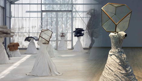 The tour of La Ribaute begins in a large open courtyard in front of the 19th-century silk factory that came with the estate. The yard is bare except for a gathering of ghostly gowns standing erect and shouldering various objects to identify the women the dresses represent. Cast from wedding gowns, these fantom females reflect the idea of the divine feminine as found in Jewish mystical literature—shekhinah—the divine bride. In this sculpture series, Kiefer extols known and unknown women, especially those erased or snubbed by history.