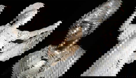 In images, the Greek goddess Athena appears in full armor, and is often referred to as Athena Promachos, meaning “Athena who fights at the front.” There was a famous bronze statue dubbed Athena Parthenos created by the 5th-century-BCE sculptor Pheidias. The colossal statue once stood on the Acropolis of Athens between the Propylaea and the Parthenon, but sadly, it no longer exists.