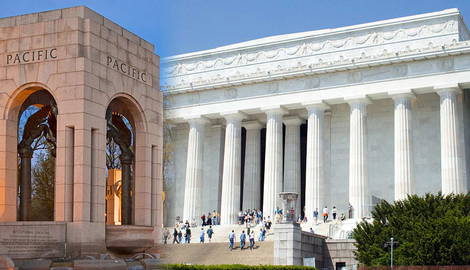 This one is located between the Lincoln Memorial and the Washington Monument on the National Mall in Washington, DC. The National World War II Memorial honors the 16 million Americans who served during World War II, including the 405,399 who gave their lives. Dedicated in 2004, it features 56 granite pillars that represent the US states and territories at the time of war and two triumphal arches that symbolize the Atlantic and Pacific theaters of the conflict.
