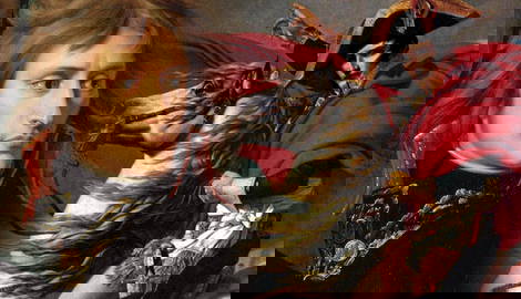 This portrait presents one of the foundations of the legend of Napoleon, the battle at Arcole and Napoleon leading the charge at enemy lines himself. Presenting Napoleon in action, charging at the enemy, this painting breaks from the conventional composition of portraits. According to military portrait tradition, the model is supposed to be in a standing position, looking at the viewer, with a distant battlefield in the background. Gros moves away from this tradition in order to manifest Napoleon’s heroic feat. With a flag in his left and a sword in his right hand, the general is heading towards the enemy but looking back at his own troops on the right. Napoleon runs in front of two conflicting sides but still manages to remain composed and without fear. The background remains a blur, unclear. The iconography of the painting returns our gaze to the face before us, which Gros elevates from every day to mythic reality.