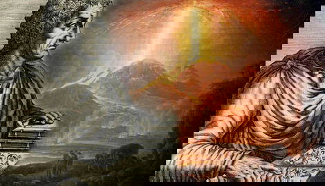 When Pliny the Elder arrives at Pomponianus’ house, he attempts to calm his friend by carrying out normal tasks. He bathes, rests, and then has dinner, with the intention of sitting out the worst of the danger. But, by the early evening, it is clear that the situation is becoming increasingly more dangerous. Pliny describes seeing “broad sheets of fire and leaping flames.” Meanwhile, houses visible in the distance are set alight by a flow of lava that is making a hasty path down the mountain.