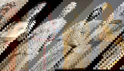 Much of our knowledge of ancient greek clothing comes from marble sculptures. That is why many people assume that people in ancient Greece wore exclusively white clothes. When seen on statues or in painted pottery, the clothing often appears to be white or monochrome. However, it has been proved that the faded color of the marble statues was once covered with paint that wore off over the centuries.