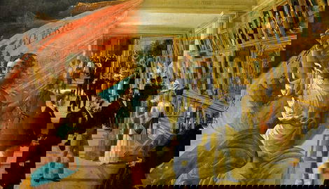 Created in 1866, when Matejko was just 28-years old, the Romantic painting depicts a desperate protest of Tadeusz Rejtan, a deputy of the Sejm (lower house of the parliament) who witnessed the first partition of Poland in 1773. In contrast to the lavishly dressed crowd from his left, Rejtan is lying splayed on the floor, his elbow positioned on the crimson drapery and his shirt torn, revealing his chest. Above him, a grand portrait dominates the interior, featuring one of the architects of the partition – the Empress of Russia Catherine the Great.