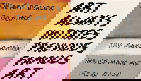 The most interesting fact about Wayne White’s text-based art is that the irony to the art world doesn’t come from the meaning of the words imposed on the canvases but from the technique itself. He converts the paintings into objects, as the painting becomes a blank canvas to Wayne White. He leaves the original landscape’s artist signature uncovered, owning the appropriation. The text onto the landscape also has an ironic note to it, but it doesn’t come as a protest against the art world, but rather to the world itself, highlighting issues such as beauty standards, drugs, money, and so on. Ironically, these cheap landscapes that White turned to circle back to Juan Uribe’s criticism of the expensiveness of the art world, speaking about what mass art has become and making us question an alternative system of the art world.