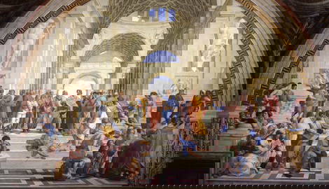 The work above depicts a scene of ancient Greek philosophy. Aristotle walks with his teacher and mentor Plato (whose appearance is modeled on Raphael’s close friend, fellow Renaissance thinker and painter Leonardo da Vinci.) The figure of Plato (center left, in orange and purple) is pointing upwards, symbolizing the Platonic ideology of philosophical idealism. The more youthful Aristotle (center right, in blue and brown) has his hand outstretched in front of him, encapsulating Aristotle’s pragmatic empirical mode of thought. Aristotle examined affairs practically as they are; Plato examined affairs idealistically as he thought they ought to be.