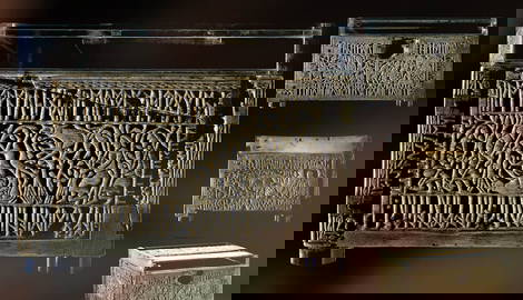 From Christian mythology, the Adoration of the Magi is depicted on the other half of the casket’s front panel. The three kings can be seen worshipping and bestowing gifts upon the newborn baby Jesus.
