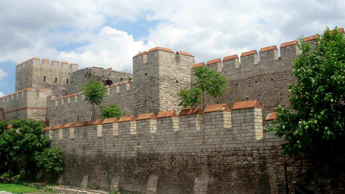 The fortification of Byzantine cities is best attested in Constantinople’s land walls, built in several different phases. The main wall is four miles long, 30 feet tall, and 16 feet wide. Additionally, it is preceded by another wall and a 60-ft-wide moat. The main wall had 96 towers and six gates used to enter the city. This is perhaps the first time in the Middle Ages that the double enceinte had been used.