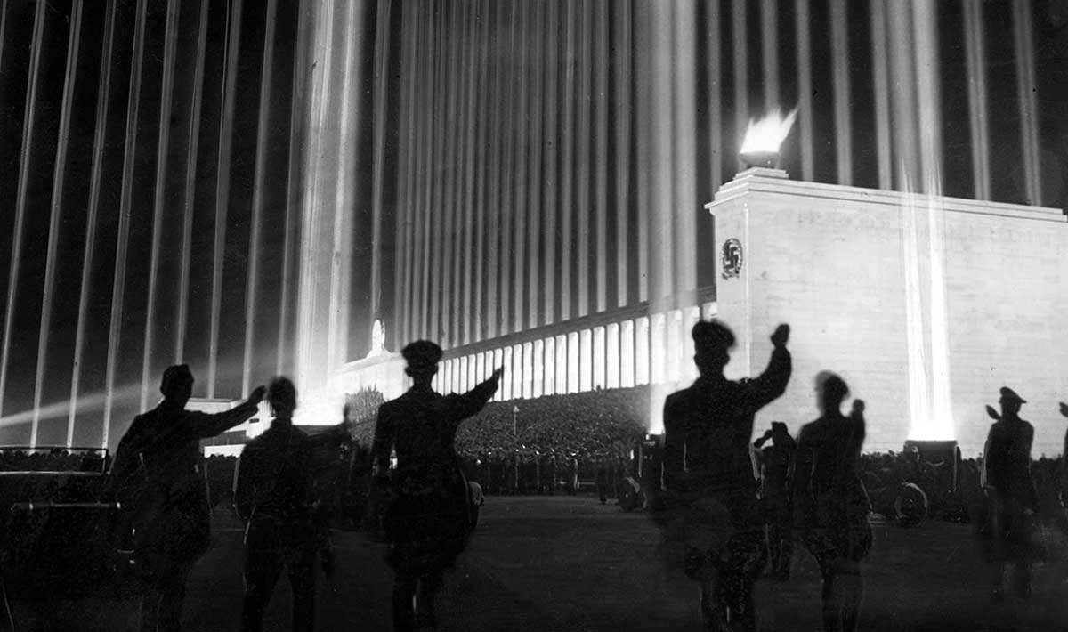 Speer also had grand ideas for the rallies to be held there. He envisioned marches in near-total darkness, the columns of flag-waving men lit by 130 searchlights beaming up into the night sky. This created the striking effect of a “cathedral of light,” now an enduring image of the Nazis’ architectural megalomania.