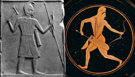 According to the Greek orates Andocides and Aeschines, 300 Scythian archers were bought from Scythia as slaves by Athens after the battle of Salamis in 490 BCE. Cleaning the streets of drunkards and disorderly and arresting those disturbing the peace of Athens, Scythian archers were said to have served as an Athenian police force during the 5th century BCE. Literary evidence of Scythian archers serving as police in Athens mainly derives from Aristophanes, a 5th-century playwright of Greek comedy. Although comedies, the works of Aristophanes allow the functions of Scythian archers to be displayed. As of now, there is no archaeological record supporting the presence of Scythian archers in Athens. However, if Scythians were in service of Athens, that would help explain the evolution of Amazons in Athenian art and the more accurate adaptation of Scythian costumes that they displayed.