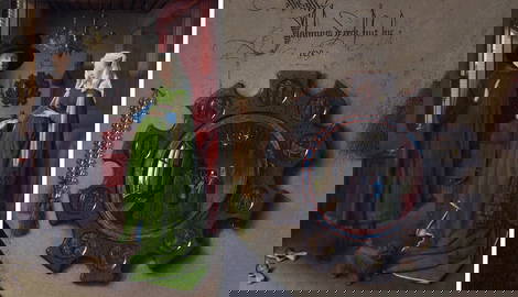 The mirror containing the supposed witnesses to this marriage is another clue to support Koster’s claims. The mirror is decorated with scenes from the Passion of Christ, and she notes that the scenes of death and resurrection are located on the side of the female while the right side contains images of Christ’s life next to the male. By observing it through this perspective, it is seen as another confirmation that the portrait was intended for a memoriam of the woman featured.