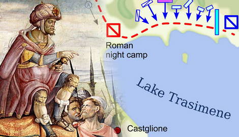 Hannibal kept his army just out of reach of the pursuing Flaminius, giving the impression that the Carthaginians were fleeing before them. The Romans were thus even more eager to catch up with them. When Hannibal reached the northern shore of Lake Trasimene, he deemed the place the perfect setting for an ambush: a narrow road that ran between the hills and the waters of the lake.