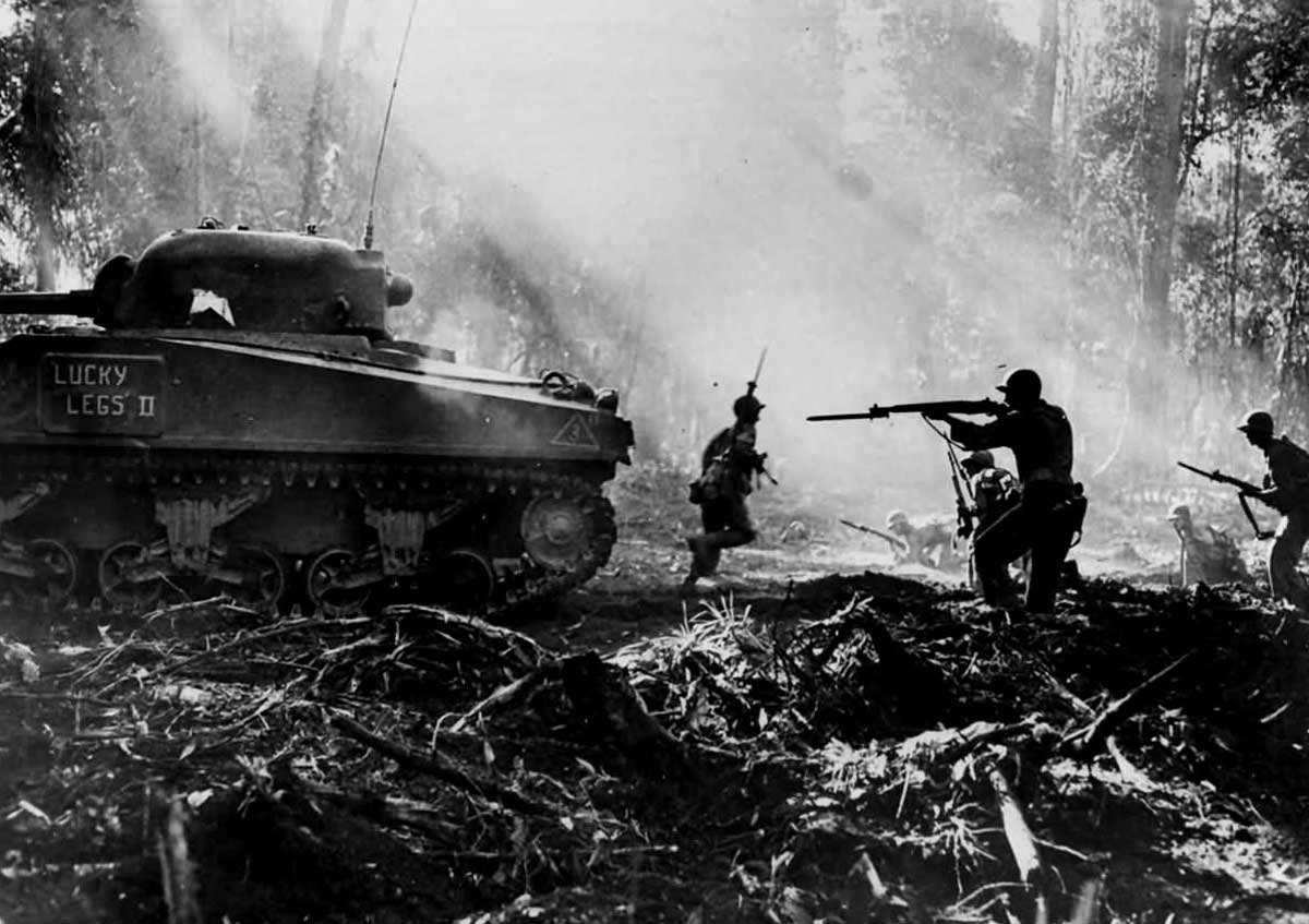 During World War II, numerous new and terrible weapons made their debut on the field of battle. Among these weapons was the “Buckshot” shell developed for tanks (itself still a new weapon). This was a newer version of the canister round developed for tank crews to use against enemy infantry units. This weapon was put into effective use by US Marines in the Pacific theater of operations, as the Japanese soldiers would attack in massive suicidal waves in an attempt to overwhelm the attacking Marines.