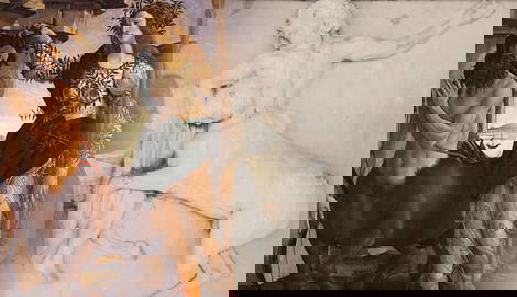 The Roman writer Lucian provided a detailed description of the painting. In the center stood a female centaur nursing a pair of infant centaurs, and in the background, a male centaur – the father held a lion in his right hand to terrify his children as a joke. This centaur family with a compassionate mother, playful children, and a caring father was a radically new conceptualization for the time.