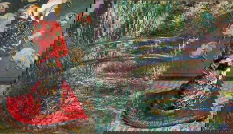 La Japonaise (Camille Monet in Japanese Costume) by Claude Monet, 1876, via The Museum of Fine Arts Boston (left); with The Lily Water Pond by Claude Monet, 1900, via The Museum of Fine Arts Boston (right)