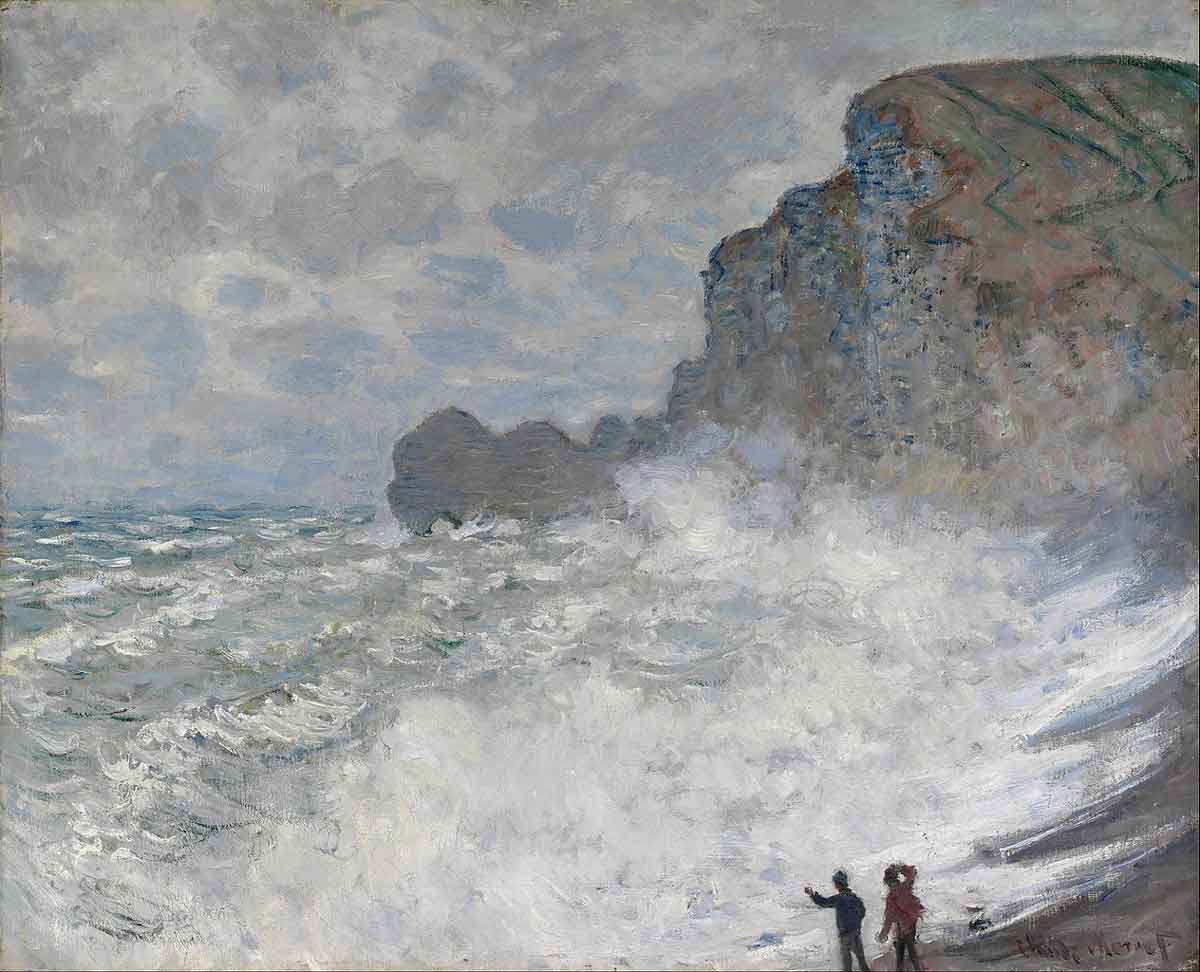 Although not as famous as his Water Lilies series, Monet showed a particular interest in seascapes, which seem to have been executed at least partly on the beach. Imagine that even Rough Weather at Étretat was probably painted right on the spot, despite the bad weather. Art specialists found a grain of sand embedded in the paint surface, which is direct proof that that particular paint was applied on the shore. In Rough Weather at Étretat, Monet focused on emphasizing the magnificent strength of nature. He applied colors in loose brushstrokes aimed, outlining a fleeting moment when big waves strike.
