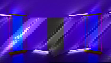 To celebrate his first-ever retrospective, Flavin even tested innovative new theories to create a complex synthesis of mood lighting and optical effects. Untitled (to S. M. with all the admiration and love which I can sense and summon) (1969) littered a lengthy 64-foot-long hallway with protruding bulbs of baby blue, pink, red, and yellow, appearing as if a glowing mirage. Stepping into its mystical aura certified a transcendental occurrence.