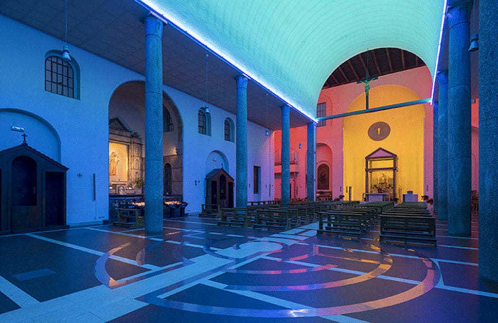 Having undergone strenuous surgery to amputate parts of his feet, by 1996 Flavin could only muster the physical strength to direct his last large-scale installation for the Prada Foundation in Milan, Italy. Flavin’s untitled neatly fused his life’s vocation into a tiny chromatic chapel, permeated by his signature hues of green, pink, and blue ultraviolet lights. His last situation at Santa Maria Annunziata Church opened a year after his untimely death in 1996.