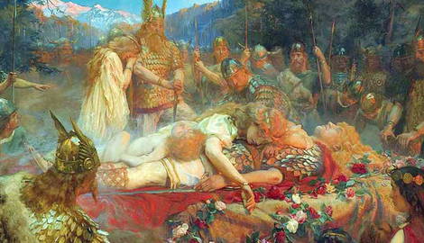 The Norse sagas preserve stories of people choosing to die on the funeral pyres of their loved ones. When the god Balder died, his wife Nanna reportedly threw herself on his funeral pyre to join him. Similarly, in the Lay of Sigurd, when Brunhild caused the death of her love Sigurd, she said to ensure that his funeral pyre was big enough for the two of them. She also made other comments about the preparation of the pyre, including that slaves should be killed, with two placed at the feet of the dead man and two placed at his head.
