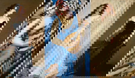 Lempicka was inspired by and studied the works of Master Renaissance Artists and used similar themes with a modern approach. Traditionally the color blue can be seen on the gowns of the Virgin Mary in Medieval or Renaissance paintings. Ultramarine blue was rare and was used sparingly for significant paintings. Here, Lempicka is unafraid to use the color as the dominant focal point in the portrait. It is this blue, along with her exceptionally strong use of smooth paint, that amplifies the luminosity and grace of her flowing dress.