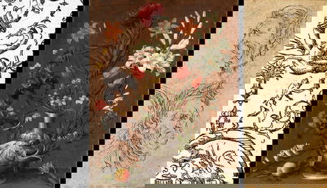 The grotesque can be recognized based on its two main characteristics. It contains a certain degree of optical illusion, and it features natural elements such as plants and animals. Since its first uses in Rome, the natural elements, called arabesques, were often used in such a manner that favored illusion. It did so in the sense that from afar, natural elements were put together in such a way that they would emulate the form of an architectural element and would reveal their true nature only when the viewer would get closer to them.