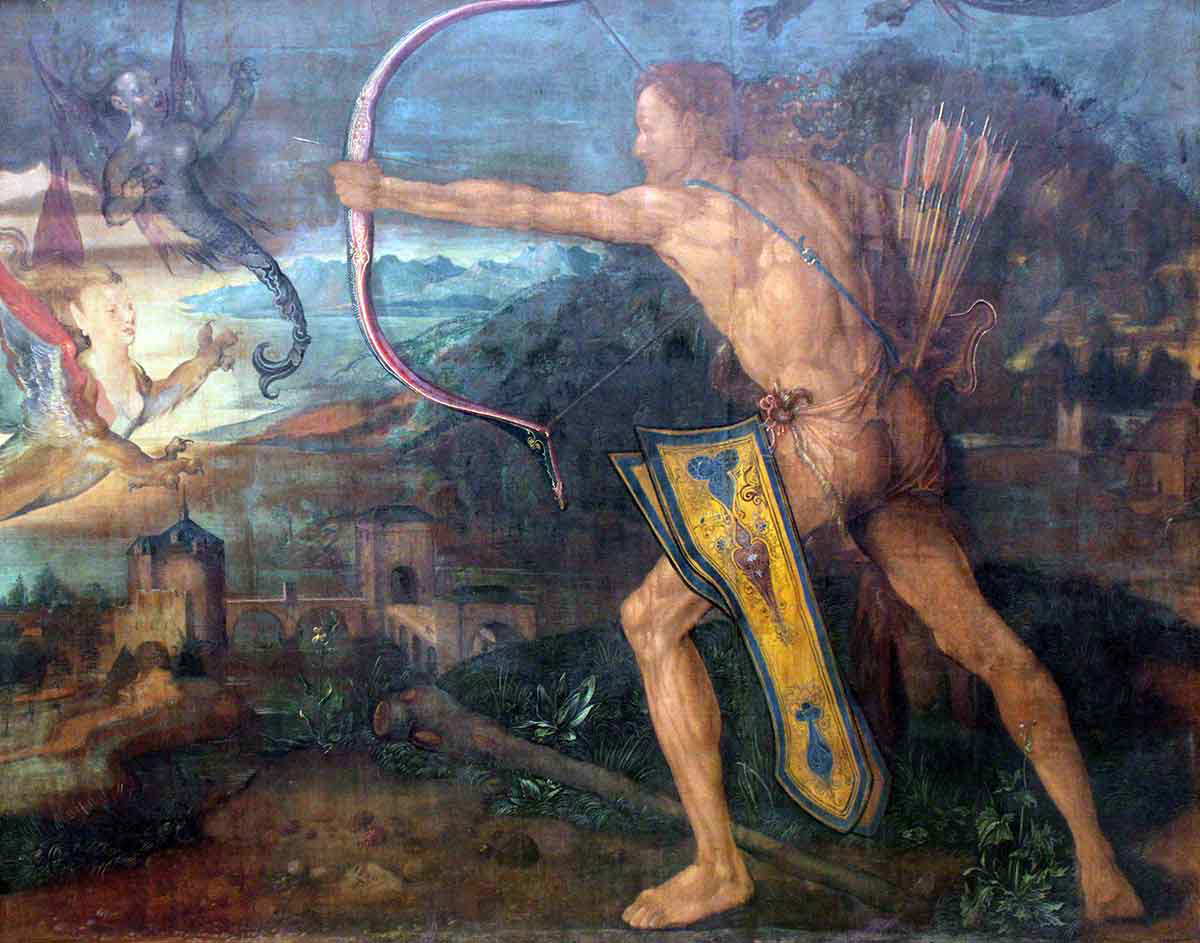 As the flock retreated to their nests, Heracles switched back to the crotalum and began playing another earth-trembling rhythmic beat to force them back out of their swampy fortress. Heracles fluctuated over the next few days between his deafening musical performance and firing arrows at the army of bronze birds. The Stymphalian birds numbered in the thousands, and shooting them out of the sky proved tedious and lengthy. The only times Heracles broke from his orchestral attack was when he needed to fletch new arrows.