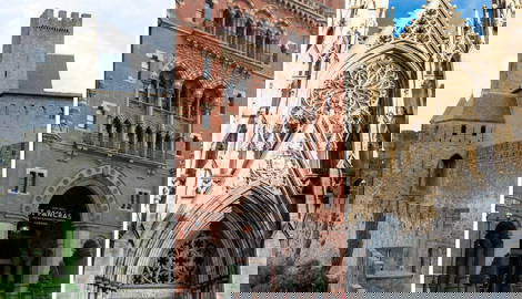 Cultural context aside, Gothic Revival is best known, and most visible today, as an architectural style. Its buildings take on many different appearances, from essentially modern constructions with sporadic Gothic elements to elaborate structures borrowing closely from surviving medieval buildings. Some remain faithful to their Gothic predecessors, while others marry Gothic with local or modern aesthetics, materials, and motifs to create something new from an old architectural vocabulary. While a few examples may manage convincing airs of antiquity, most betray their relative youth in one way or another. Gothic Revival buildings tend to reflect 19th-century views of the Middle Ages, which don’t necessarily represent the Middle Ages itself.