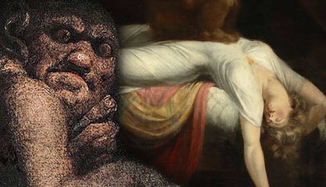 The Nightmare was completed in 1781 and exhibited for the first time at the Royal Academy of Arts in London in 1782. It features a vulnerable woman sleeping in a stark white gown that contrasts the rest of the painting’s dark shadows, drawing the focus to her unconscious body that is being visited by a mare. A mare is a creature of Germanic folklore, a malevolent spirit that sits on the chests of sleepers to induce unpleasant dreams. Nearly all Germanic languages, including English, remember this folkloric creature linguistically with the word nightmare in English or mareritt (mare-ride) in Norwegian.