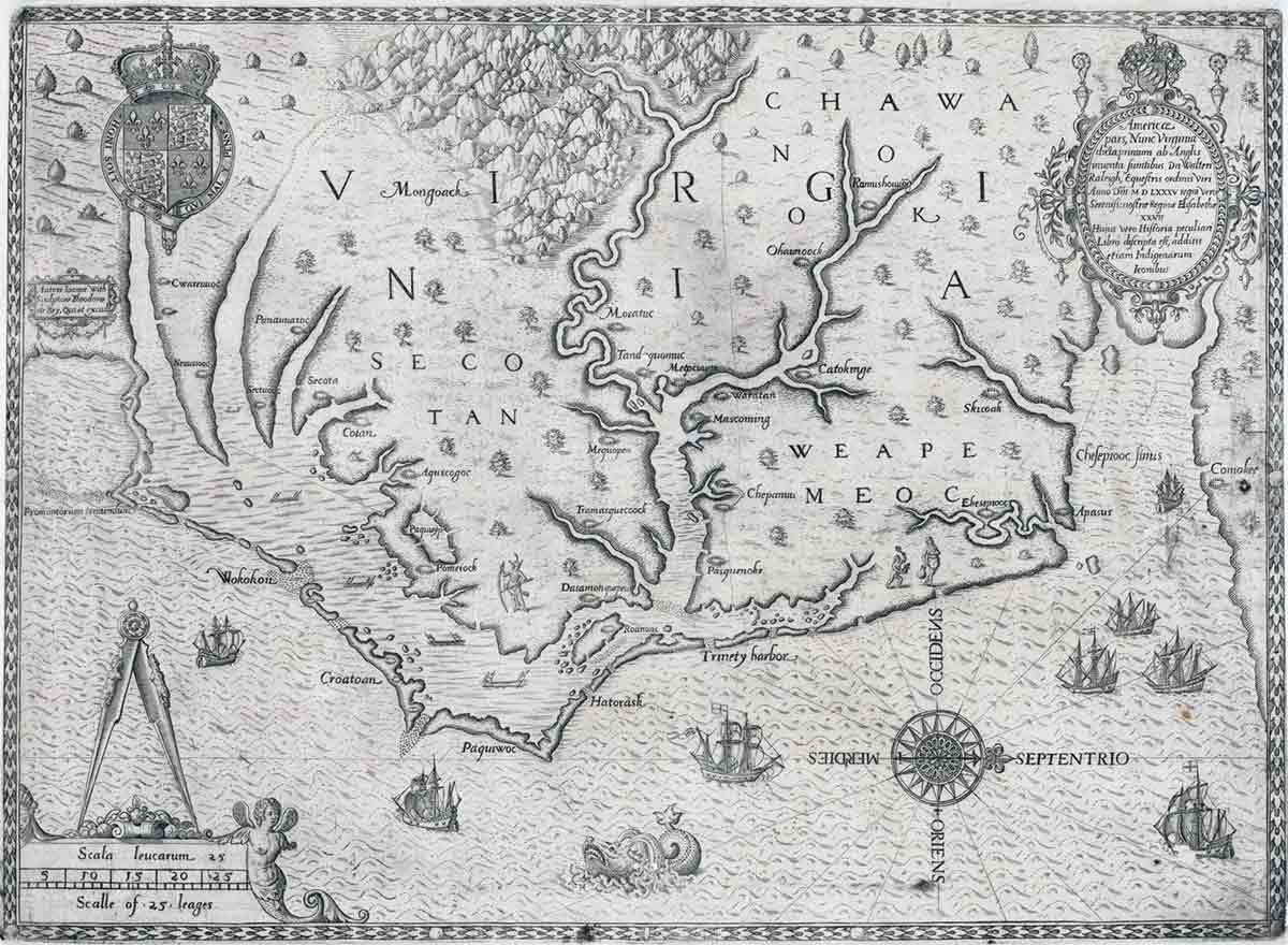 Take the Americae pars map of Virginia from 1590, the first settlement of the British in America. The lack of urban space and emphasis placed on trees and empty space suggests that the patron of this map was driven by a colonial ambition to dominate the land. It could yield potential resources for trade or space for settlement.