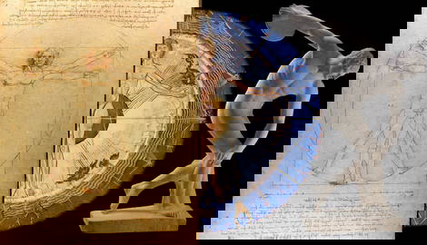 His notes, written in mirror writing, state that the drawing was a study of the proportions as described in Vitruvius’s work De Architectura. When we look closer at the text and compare it to Leonardo’s drawing, we can see a few differences in the height of the raised arms and the square and circle centered at the man’s groin. It appears that Leonardo da Vinci improved the model based on his observations, using his incredible skill set.