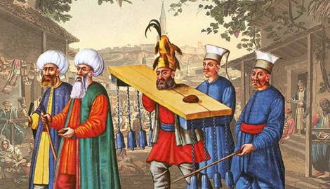 Tradesmen, merchants, and tailors who committed fraud and deceived their customers were often put in the stocks. Like in Europe, Ottoman stocks consisted of a large wooden board—with bells attached—that was placed around an offender’s neck. He would be forced to march down the street, surrounded by janissaries, the sultan’s imperial soldiers. These janissaries would loudly announce the perpetrator’s crimes, which was both a method of humiliation and a way of informing townspeople of a dishonest salesman.