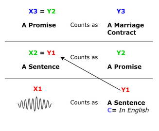 Two formal attributes of constitutive rules answer the issue, namely, they iterate upward and spread out laterally. The complexity of institutional and social reality is partly due to the iteration of constitutive rules such that a ‘Y’ in a lower level is an ‘X’ in a higher one. Searle provides an illustration that goes from vocal noises to marriage (2011). Making certain noises ‘X1’ counts as an utterance of an English sentence ‘Y1’; the utterances of certain sentences in English ‘X2 = Y1 ’ count as making a promise ‘Y2’; promises of some type (X3 = Y2 ) count as being married, all in contexts Cn (Searle, 2011). We can represent this in the following diagram:
