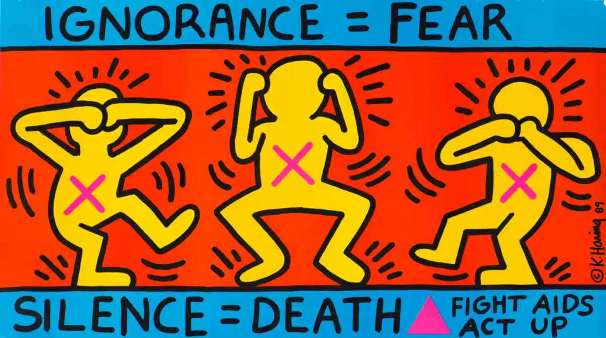 Perhaps most impactful of all in fighting the AIDS epidemic through art was Keith Haring. The graffiti artist made anti-crack, anti-apartheid, pro-LGBTQIA+ works in the subways of New York. He wanted to educate people about these issues. Shortly after his diagnosis, Haring was commissioned by the New York City Department of Health to create posters for the AIDS hotline that provided information and HIV testing.