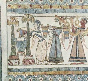 Male gods are neither rare nor unimportant in Minoan religion, but there is an undeniable dominating presence of female deities. Manifesting in multiple forms, the goddess of nature appears in the iconography of vibrant palace frescos, pottery, and clay figurines left as offerings in sacred peak sanctuaries and caves. On the famous Late Minoan Hagia Triada sarcophagus, it is only females who perform the sacrifice and altar rites whilst the males have minor roles as musicians and the bearers of offerings. The Minoan people were constantly immersed in nature, whether that be through the physical landscape of Crete itself or through the iconography that decorated their frescos, the goddess was eternally present.