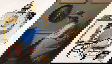 The mirror featured in Girl at Mirror by Norman Rockwell is a simplistic approach to a complex subject. A girl is seen sitting in front of a wall mirror that is propped up by a chair. As the viewer, we have no indication as to where she is or where we are supposed to be. In her lap is a photo of actress Jane Russell and on the floor there are brushes and makeup. Her doll is cast aside while she focuses on herself through the mirror.
