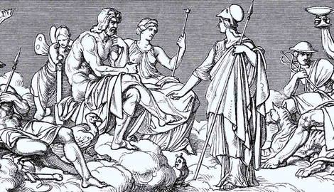 A key step in setting up the conflict was the wedding of Thetis to the mortal hero Peleus, a union that produced the hero Achilles. All the gods were invited except for Eris, the goddess of strife. Irritated, she took an apple from the garden of the Hesperides and wrote on it “for the fairest,” and threw it into the party. Hera, Athena, and Aphrodite claimed the apple. To settle the argument, Zeus invited the Trojan prince Paris to judge which was the fairest. Each goddess bribed him with a magnificent present, but he chose Aphrodite, who offered him the most beautiful woman in the world, Helen.