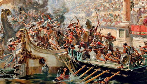 To celebrate the completion of the Colosseum, Titus held, among other spectacles, a naumachia that re-enacted a historical Greek naval battle from the Peloponnesian War in 434 BCE.