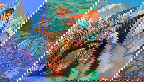 Stylewise, his paintings depicting Russian epics are similar to his Indian paintings. His love for contrasts and exaggerated forms dominate the composition. The immersive nature of his works sweeps the onlooker away, transporting him to a mystical place; Kitezh or Shambhala, or, perhaps, Shangri-La, the term that became a moniker for any lost city.