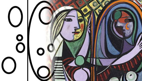 The diagram above shows that the left vertical that frames the mirror is a symmetry line. You can see how effective it is at creating partial symmetry. However, in this image, it doesn’t automatically create balance. The composition is dominated by circles. In composition, curves are used to balance angles. Picasso knew this, so he used the background to create balance. The background is patterned with squares. The background contains angles, and the foreground is mainly curved, except for the two verticals that frame the mirror and the stripes that act as detail. The final painting is complex, so the composition needs to be strong. A simplistic image might be more forgiving but wouldn’t reveal his high skill level. Picasso was bold in his choices, and this image is full of pattern and color, yet it isn’t overwhelming.