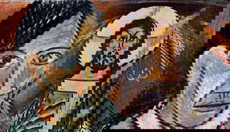 These figures also have geometrical facial features. Their heavy eyebrows are shown in the form of strict lines and their almond-shaped eyes are very peculiar. Even their feet have geometrical shapes, as they are triangularly pointed. The dresses also look similar since Picasso painted dresses in medieval fashion. Another interesting fact is that Picasso’s painting was made on a panel and not on canvas, and panels were broadly used in the middle ages.