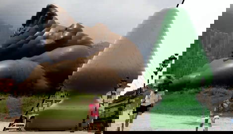 The huge inflatable work Complex Shit was exhibited outside of the Paul Klee Centre in Berne, Switzerland in 2008. Unfortunately, it got blown away and it destroyed a power line and a window at a children’s home. After traveling from its original location, it landed on the grounds of the children’s home. Headlines like Inflatable faeces raises a stink or Up in the sky: is it a turd? Is it a plane? were published in newspapers after the incident happened. The sculpture had a safety system made to deflate the piece during bad weather conditions, but the mechanism did not work. Complex Shit was part of an exhibition titled East of Eden: A Garden Show at the Paul Klee Centre in Berne.