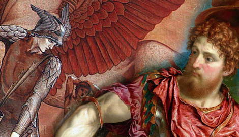 Just after midnight, he donned all the gifts given to him by the gods, except for Hades’s helmet, as he could not see his reflection in the shield while invisible. Fully prepared, he descended, flying low to avoid making noise with his footsteps.