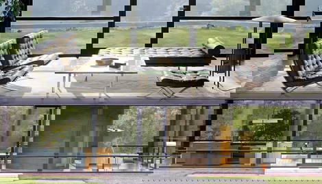 There are also materials that dominate furniture design. For example, wood is used for the kitchen cabinets, the bathroom door, and the closet behind the bed. Steel was used to make the chairs and the daybed, which were designed by Mies van der Rohe, as well as the coffee table. Overall, these materials help create a light, minimal, and natural-looking space that blends in well with its natural surroundings.