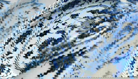 The Ming Dynasty (1365-1644) produced the distinctive blue-and-white porcelain known to enthusiasts today. Hard-paste Chinese porcelain’s main components are kaolin and petuntse (which produced the pure white color), and the wares are painted under a transparent glaze with cobalt oxide which gives a rich blue color after firing at 1290 C. By the 16th century, the designs seen on Chinese hard-paste porcelain included multi-colored scenes using complementary colors – the ubiquitous blue, and also red, yellow, and green. Designs portrayed stylized flowers, grapes, waves, lotus scrolls, vine scrolls, reeds, fruit sprays, trees, animals, landscapes, and mythical creatures. The most well-known Ming design is the blue-and-white scheme which dominated Chinese ceramic works from the early 14th century to the late 1700s. Typical vessels produced in China include vases, bowls, ewers, jars, cups, plates, and various objets d’art like brush holders, ink stones, lidded boxes, and incense burners.