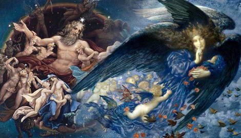 In the centuries following Hesiod’s composition of the Theogony, several additional primordials were introduced, many of which stemmed from the cult of Orphism. Among them are Ananke, the primordial embodiment of inevitability, compulsion, and necessity, and her consort, Chronos, who personifies time. This couple emerged spontaneously at the dawn of the universe as incorporeal, serpentine beings that intertwined, breaking the world egg and giving life to the primordial god Phanes. They organized the cosmos into its various parts and governed the rotation of the heavens and the flow of time.