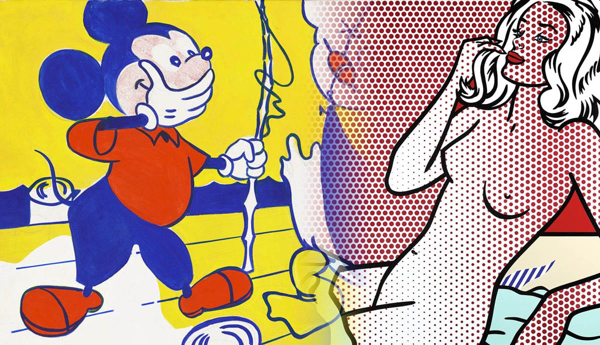 Lichtenstein’s work is known for its Ben-Day dots and comic-inspired aesthetic and iconography. His first work in his signature style is the painting Look Mickey (1961) which features the characters Mickey Mouse and Donald Duck. It is said that Lichtenstein produced the painting after his son compared his work to a comic book with Mickey Mouse, saying, “I bet you can’t paint as good as that, eh, Dad?”