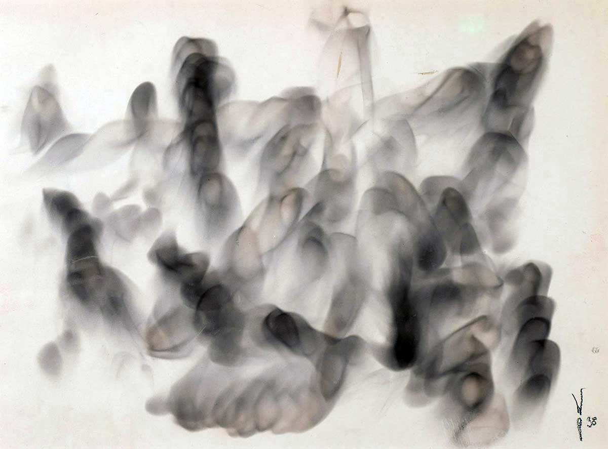 The technique was invented by Austrian-born artist Wolfgang Paalen in the late 1930s. The term fumage originates from the French word for smoke/smoking. In 1938 Paalen created his first oil painting based on fumage. Up until then, he applied this method on paper only. Smoke provided Paalen with the possibility to create ethereal forms, hazy patterns, and illusory and phantom-like shapes. By mobilizing the unpredictable nature of smoke, Paalen produced superlunary and mysterious imagery, evoking apparitions, dreams, and impulses that seemed to emerge from the depths of the human psyche.